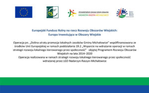 | Wsparcie na wdrażanie i zarządzanie strategią rozwoju lokalnego kierowanego przez społeczność dofinansowane ze środków Unii Europejskiej w ramach EFRROW w ramach Planu Strategicznego dla Wspólnej Polityki Rolnej na lata 2023-2027. Instytucja Zarządzająca Planem Strategicznym dla Wspólnej Polityki Rolnej na lata 2023-2027 – Minister Rolnictwa i Rozwoju Wsi. |